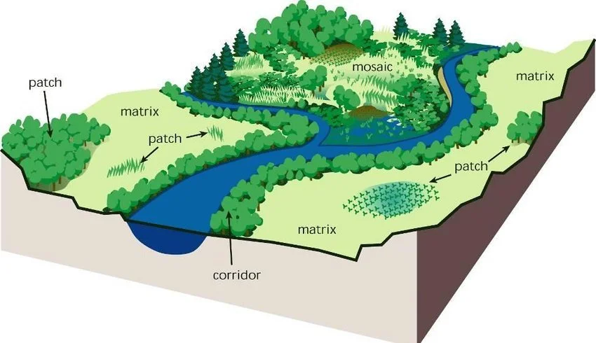 One prominent conceptual model for understanding landscapes presents them as mosaics – patterns of juxtaposed landscape elements. These elements include discrete ‘patches’ of habitat sitting withing a non-habitat ‘matrix’, potentially connected by linear ‘corridors’. Known as the Patch-Corridor-Matrix model, habitat in this model is defined based on the needs of a specific organism.